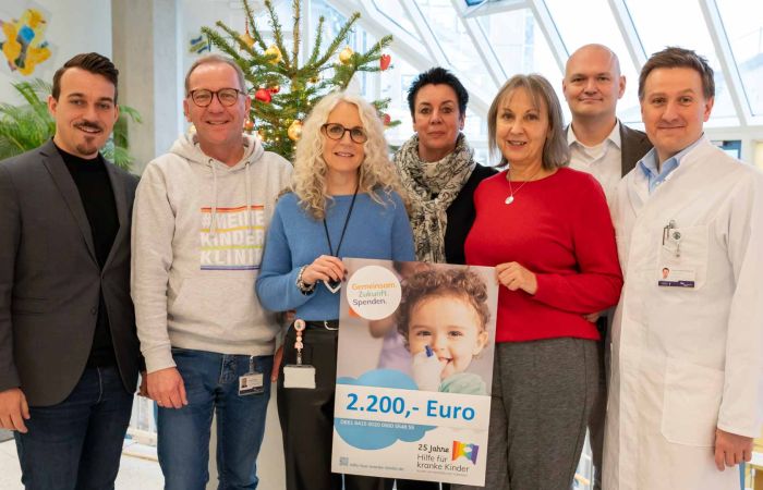 Foto: Maximilian Nägele, Kaufmännischer Geschäftsführer der Kinderklinik, Thomas Hassel, Vorstandsvorsitzender der Stiftung, Birgit Meßmer, Nicole Glückler und Alexandra Sommer mit Prof. Dr. Johannes Schulte, Ärztlicher Direktor der Abteilung I sowie Prof. Dr. Hendrik Rosewich, Ärztlicher Direktor der Abteilung III der Kinderklinik (v.l.) (Foto: Karoline Niethammer)