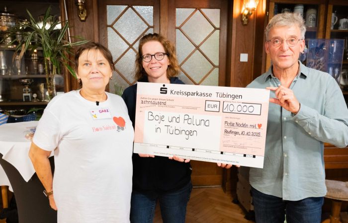 Die Spende fließt zu einer Hälfte an die Stiftung Hilfe für kranke Kinder zur Unterstützung des ambulanten Palliativteams PALUNA der Kinderklinik Tübingen. Die andere Hälfte kommt dem Tübinger Hospizdienst BOJE e.V. zugute. Das nächste Treffen der flotten Nadeln mit Herz ist am 4. November von 15 bis 21 Uhr. Wer noch nicht Stricken oder Nähen kann, aber trotzdem mitmachen möchte, ist bei dem Handarbeitsworkshop jeden Dienstag um 15 Uhr herzlich willkommen.
