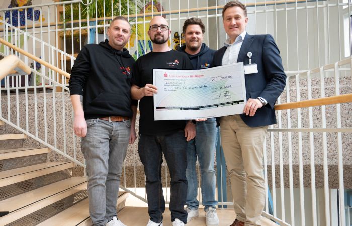 Die beiden Vorstände Michael Stapf und Alexander Kisch überreichten die Spende persönlich an Philipp Nährig von Hilfe für kranke Kinder und den ärztlichen Direktor Prof. dr. med. Hendrik Rosewich. (Foto: Ann-Sophie Becker)