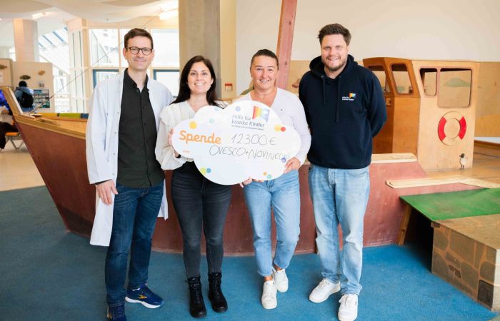 Die Geschäftsleitungen der Ovesco Endoscopy AG und der novineon CRO GmbH stocken den Erlös aus dem Kuchenverkauf auf. Gemeinsam erhöhten sie die Spendensumme, sodass Ana Invankovic und Laura Zenker am Ende insgesamt 12.300 Euro an HILFE FÜR KRANKE KINDER übergeben konnten.