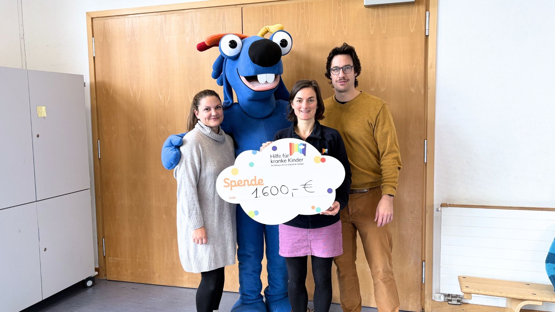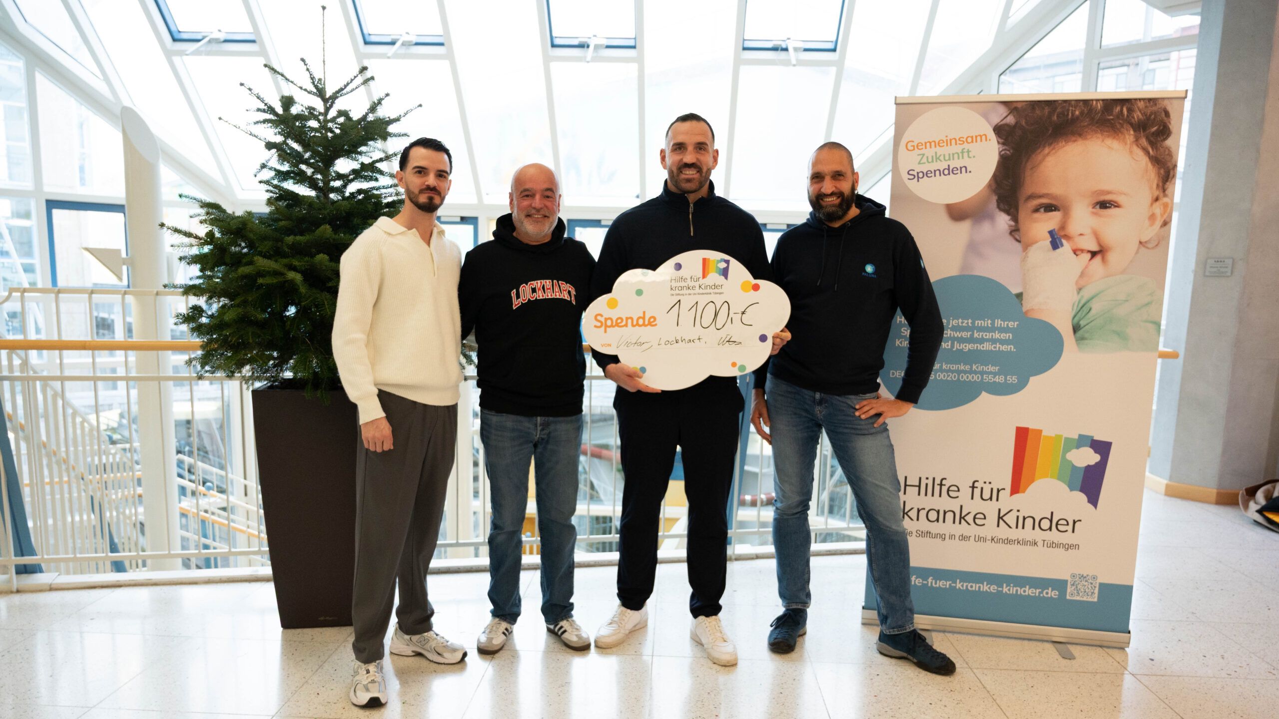Der deutsche Schwergewichtsmeister im Boxen kam für die symbolische Spendenübergabe persönlich in die Kinderklinik. Auf dem Foto von links nach rechts: Unsal Chicheck, Volker Kunz von Lockhart Clothing, Victor Daniel und Dr. Thomas Eichholz von PALUNA. (Foto: Ann-Sophie Becker)