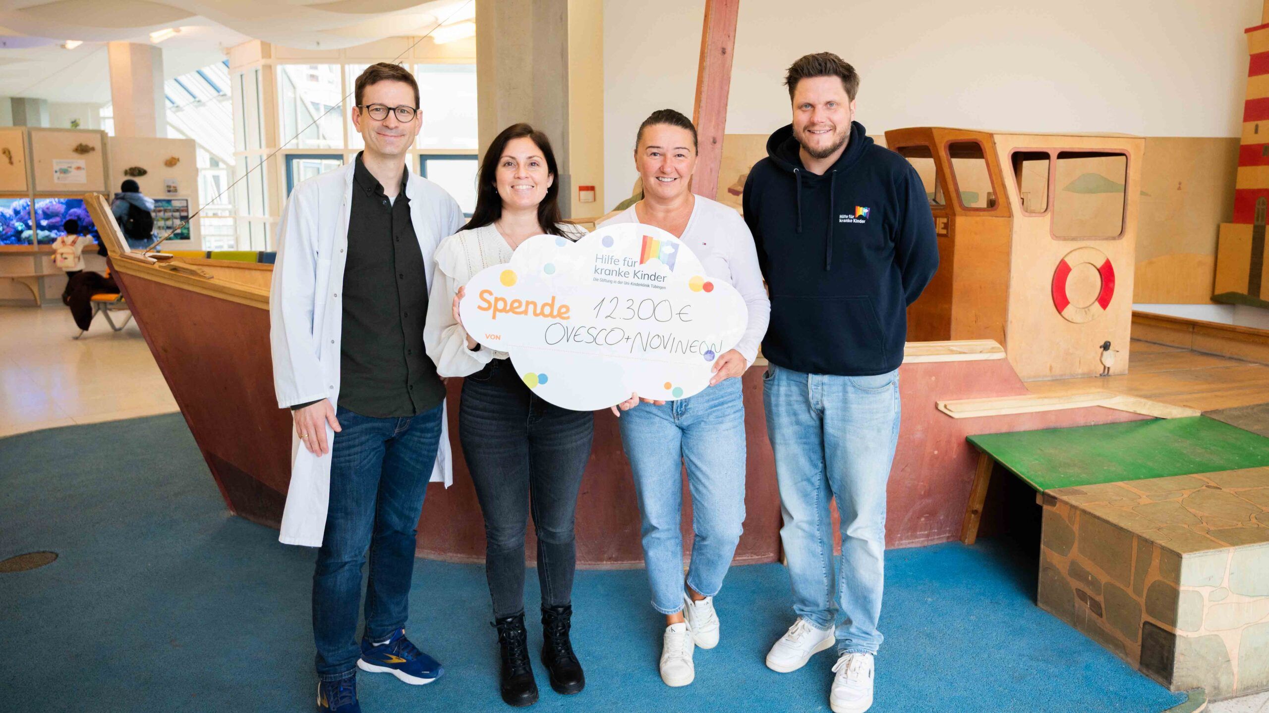 Die Geschäftsleitungen der Ovesco Endoscopy AG und der novineon CRO GmbH stocken den Erlös aus dem Kuchenverkauf auf. Gemeinsam erhöhten sie die Spendensumme, sodass Ana Invankovic und Laura Zenker am Ende insgesamt 12.300 Euro an HILFE FÜR KRANKE KINDER übergeben konnten.